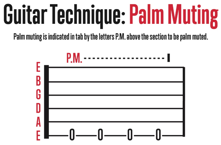 Palm muting is one of the most used techniques in Rock guitar. It is done by having the palm of your picking hand in contact with the strings as you pick them. Heavy palm muting produces a tight rhythmic sound, while light palm muting lets the notes ring out a little more. Beginners reading guitar music should look for the letters "P.M." above the section that needs to be palm muted.