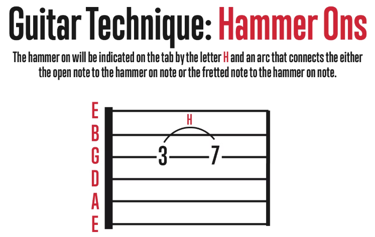 The hammer-on is a cool guitar technique where you don't pick the note but you "hammer on" the note with your fretting finger. You can hammer on from an open note or a fretted note, and the resulting note will be higher. The hammer-on will be shown on the guitar tab by the letter "H" and an arc that connects either the open note to the hammer-on note or the fretted note to the hammer-on note.