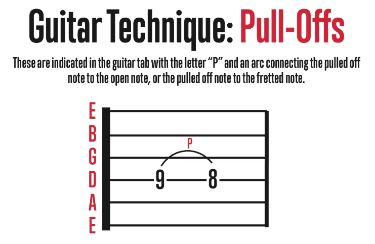 Pull-offs are the exact opposite of the hammer-on. Instead of pushing down on the string, you pull off the string to an open note or a note you are fretting with another finger. These are shown in the guitar tab with the letter "P" and an arc connecting the pulled-off note to the open note, or the pulled-off note to the fretted note. The resulting note will be lower.