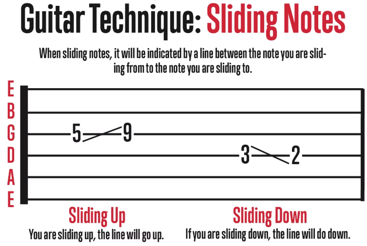 Sliding is another useful technique; you can slide up or down to the next note. This is different than bending since you will slide your fretting finger up or down to the desired fret.