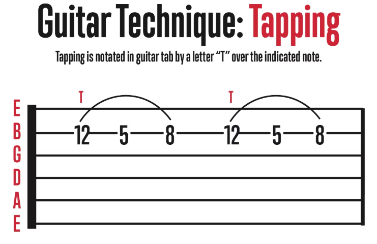 Tapping is a popular technique that involves fretting notes with your regular fretting hand while also "tapping" or fretting notes with the index finger of your picking hand. The tapping of your picking hand is a variation of a hammer-on. Tapping is notated in the guitar tab by a letter "T" over the indicated note.