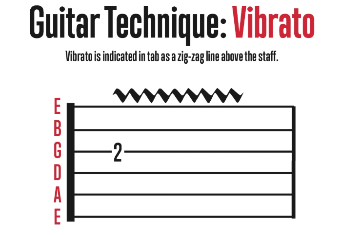 Vibrato is the technique of repeatedly bending a note and returning to the original pitch without releasing the note. This produces an expressive note and tone, and vibrato is shown in the guitar tab as a zig-zag line above the staff. When learning how to read guitar tablature, beginners should look at the length of the line for the vibrato. In general, the longer the line, the longer you should apply the vibrato.
