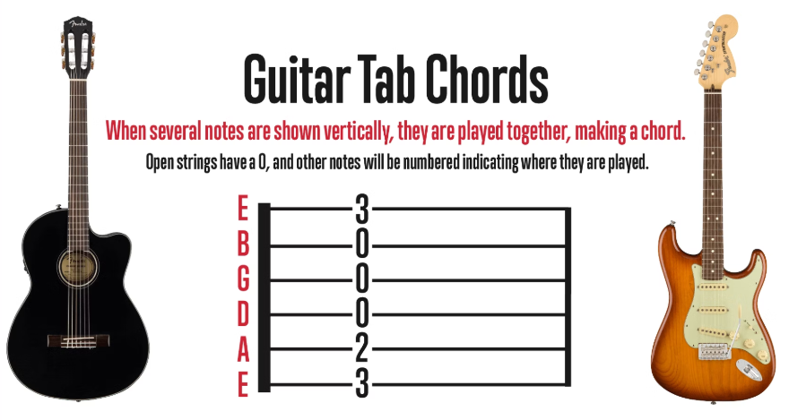 Guitar tablature is read left to right, and all notes shown are in chronological order. When the numbers are in line with each other vertically, they represent a chord. A chord is played by strumming all the indicated strings at the same time. Guitar tab notation is better for beginners than standard notation, for it tells you what notes to play to make the chord and where you can find them on your guitar.